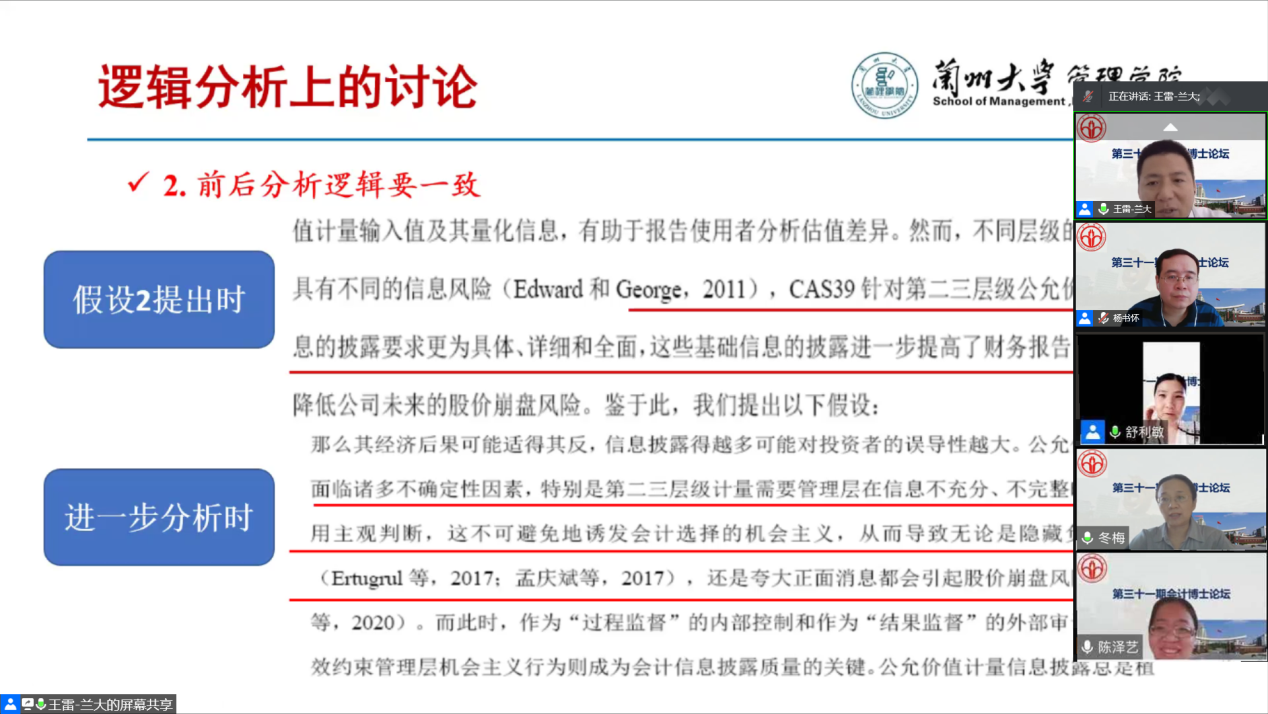 7月5日上午9:00-11:00,pg游戏电子模拟器与科研处联合举办的第三十一期会计博士论坛在腾讯会议线上召开。此次论坛主题是杨书怀教授报告其工作论文:公允价值分层计量降低了股价崩盘风险吗?——基于内外部监督的调节效应检验。论坛邀请了兰州大学管理学院会计系主任,会计学术联盟联合发起人王雷博士对杨教授的论文进行点评。pg游戏电子模拟器院长文芳教授、副院长舒利敏博士、周静博士、吴冬梅博士、陈泽艺博士等20多位教师以及20级部分研究生和本科生参加了本次论坛。