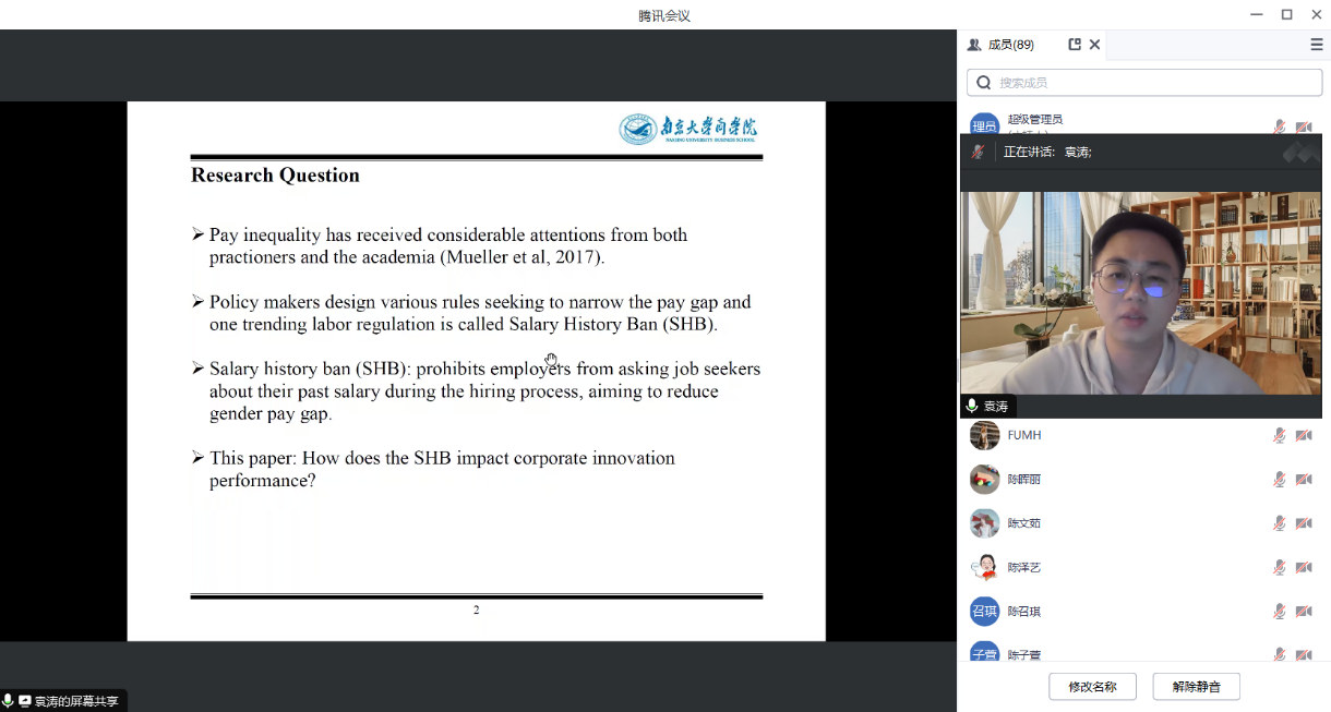 10月25日晚上19:00-22:00,由pg游戏电子模拟器、教师发展中心、粤港澳大湾区产业升级与企业创新研究中心联合举办的第五十期会计博士论坛通过腾讯会议线上召开。本次论坛邀请南京大学助理教授袁涛老师为全院师生作“Salary History Ban and Corporate Innovation”和“国家自科项目申报经验分享与交流”两个主题的专题报告。论坛由pg游戏电子模拟器副院长舒利敏主持,李亚超博士、周静怡博士等百余名师生参加了本次活动。