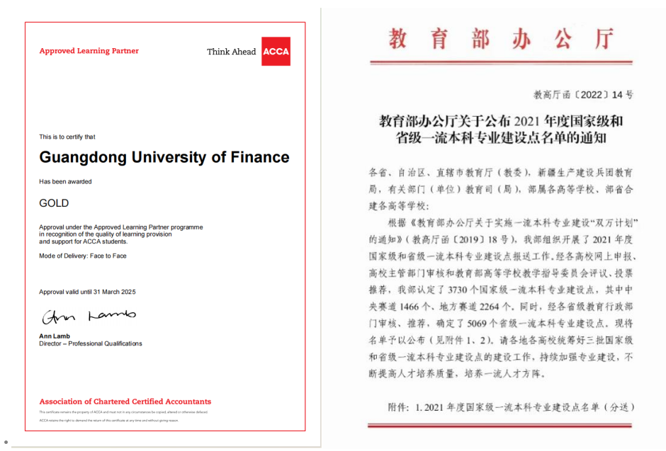 2、就读ACCA“黄金级合作办学机构”,国家一流专业。由于优秀的人才培养质量和办学效果,我校于2022年6月获得ACCA官方授予的“黄金级合作办学机构”资格,是广东省第四所获得此资格的高校。此外,pg游戏会计学专业是教育部认证的“国家一流专业”、“广东省一流专业”。