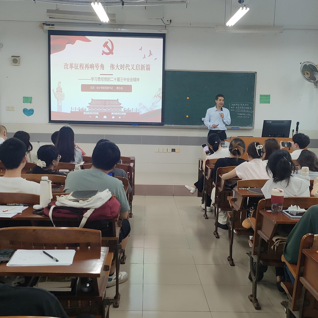 活动最后,汤四新教授对本次课程进行了补充发言,他强调构建中国自主会计知识体系,同学们需要思考如何使研究选题更具有研究价值和创新性。舒利敏副院长对本次思政课进行了总结,她指出,党的二十届三中全会精神不仅为同学们的学习和职业规划指明了方向,其中还蕴含了许多与时俱进的研究选题,值得同学们进一步思考和挖掘。