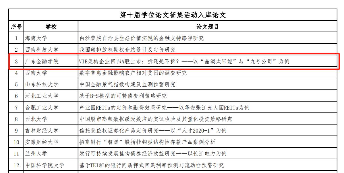 近日,全国金融专业学位研究生教育指导委员会公布了《关于中国金融专业学位论文中心第十届学位论文征集活动结果的通知》,pg游戏电子模拟器财务管理系主任陈见丽教授指导2021级金融硕士研究生余诗瑶完成的学位论文《VIE架构企业回归A股上市:拆还是不拆?——以“晶澳太阳能”与“九号公司”为例》入库中国金融专业学位论文中心。