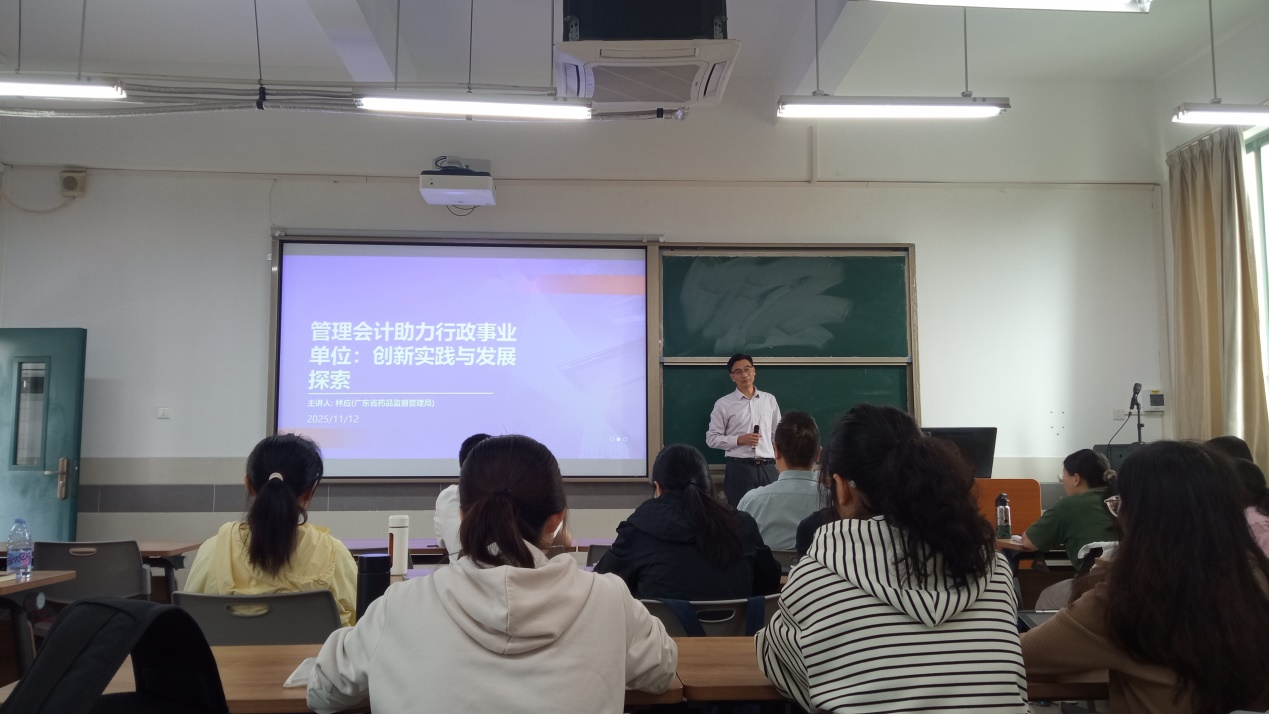 2025年11月12日下午,pg游戏电子模拟器pg游戏电子模拟器在北教B407成功举行行业导师进课堂活动。本次活动邀请了广东省药品监督管理局办公室主任林应导师(原财务处处长、一级调研员)担任主讲嘉宾,走进管理会计理论与实务课堂,讲课主题为“管理会计助力行政事业单位:创新实践与发展探索”。本次行业导师进课堂活动由pg游戏电子模拟器赵剑锋副教授主持,2025级会计专硕全体学生参与本次活动。 讲座伊始,林应主任首先对管理会计与行政事业单位的基本概念进行了系统梳理。他结合广东省深化机构改革的背景,详细阐述了行政事业单位的职能分类与运行特点,包括行业专项管理、市场监管体系、公共安全与司法保障、自然资源与生态保护等职能模块,并指出事业单位在提供公共服务方面的重要支撑作用。他强调,管理会计正在从传统的“账房先生”向“战略参谋”转变,其核心价值在于优化资源配置、提升运营效率、强化绩效管理和支撑科学决策。 接着,林主任结合广东省药监局的实际工作,分享了管理会计在行政事业单位中的创新实践。他提出“管理会计循环驱动链”模型,涵盖“规划决策—成本控制—绩效监督”三大环节,并通过六个典型案例生动展示了管理会计在预算编制、内控建设、绩效评价等方面的具体应用。林主任指出,“预算编制是规划实施的关键,项目能否立项并纳入预算,直接决定后续工作的开展”,凸显了管理会计在政府资源配置中的枢纽作用。 在探讨管理会计在行政事业单位中的深化路径时,林主任提出四点建议:深化业财融合、创新人才培养、加快信息技术应用、优化政策环境。他特别鼓励年轻师生积极探索人工智能在管理会计中的实践路径,并系统阐述了AI如何破解传统管理会计在数据孤岛、分析浅层、效率低下等方面的痛点。他从“智能预算管理”“精准成本控制”“科学绩效评价”等场景出发,描绘了“AI+管理会计”在政府治理中的广阔前景。 在课堂互动环节,与会师生围绕“政府采购中的挑战与应对”“职业生涯发展建议”“业财融合实践路径”等问题踊跃提问。林主任结合自己二十三年的机关工作经历,强调“诚实、公正、忠诚”是财务人员的立身之本,鼓励大家在守住底线的基础上勇于担当、创造价值。 最后,林主任以“学以致用、知行合一、精业笃行、守住底线、修身明德、久久为功、胸怀大局、勇于担当”三十二字箴言勉励在场师生。他希望大家锤炼专业本领,恪守职业操守,提升人生格局,强化使命担当,在新时代背景下,立足粤港澳大湾区建设,投身“十五五”规划实践,争做“价值创造者”,为高质量发展贡献会计智慧与力量,谱写时代华章。